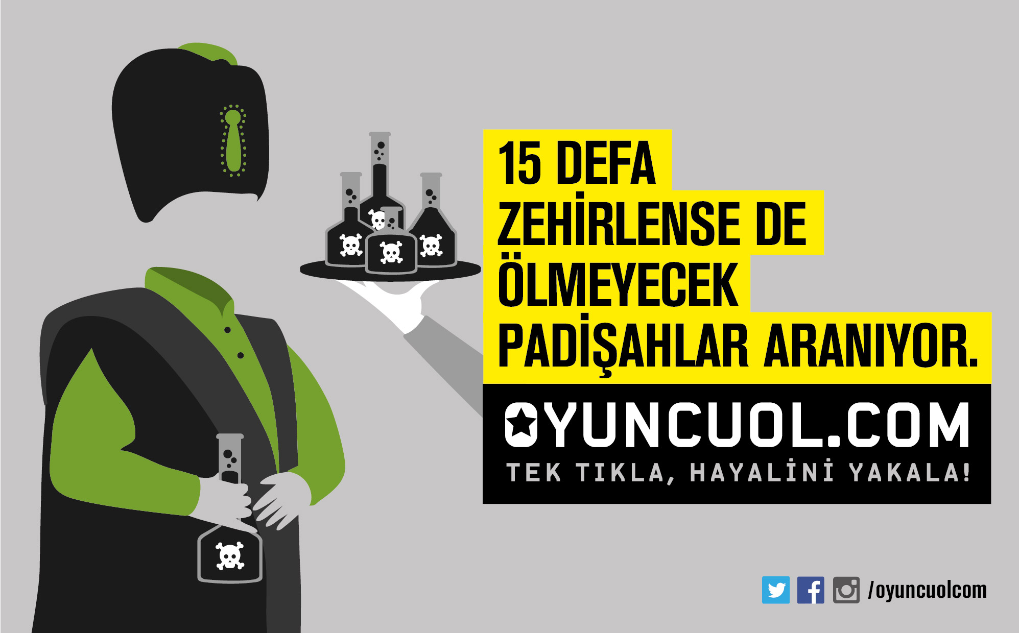 Renkli başlıkları ve illüstrasyonlarıyla dikkat çeken kampanya ile “28 kere vurulsa da yıkılmayacak mafya babaları”, “15 defa zehirlense de ölmeyecek padişahlar”, “24 saat uyusa da fönü bozulmayacak köşk sakinleri” gibi yeni yüzler aranıyor.