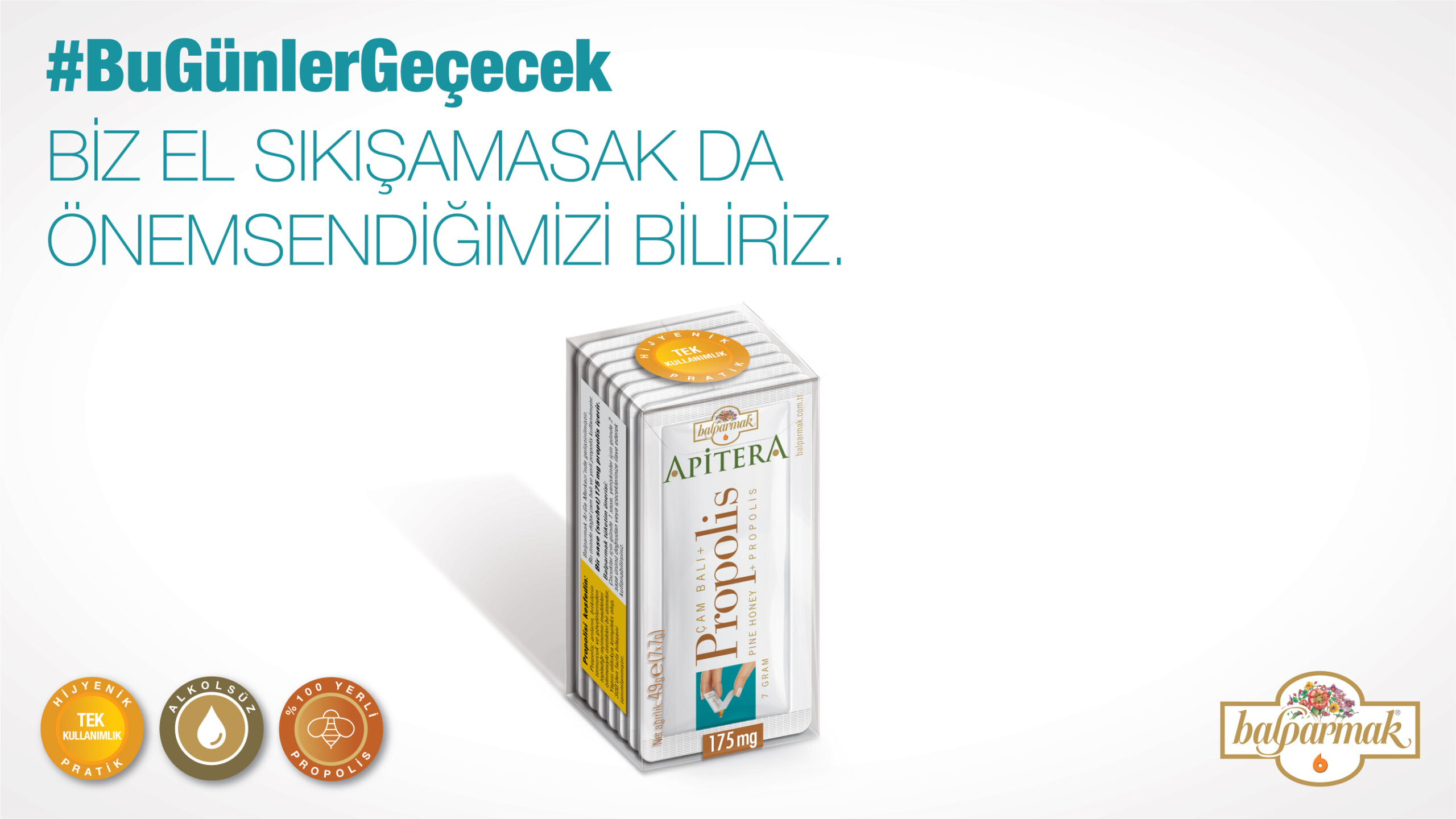 Tedbiri elden bırakmamak gerektiğinin de hatırlatıldığı reklam filminde, çam balı ile tatlandırılan Balparmak Apitera Propolis’in tek kullanımlık, hijyenik, pratik ambalajda sunulduğu, alkolsüz olduğu ve %100 yerli propolis içerdiğinin de altı çiziliyor.