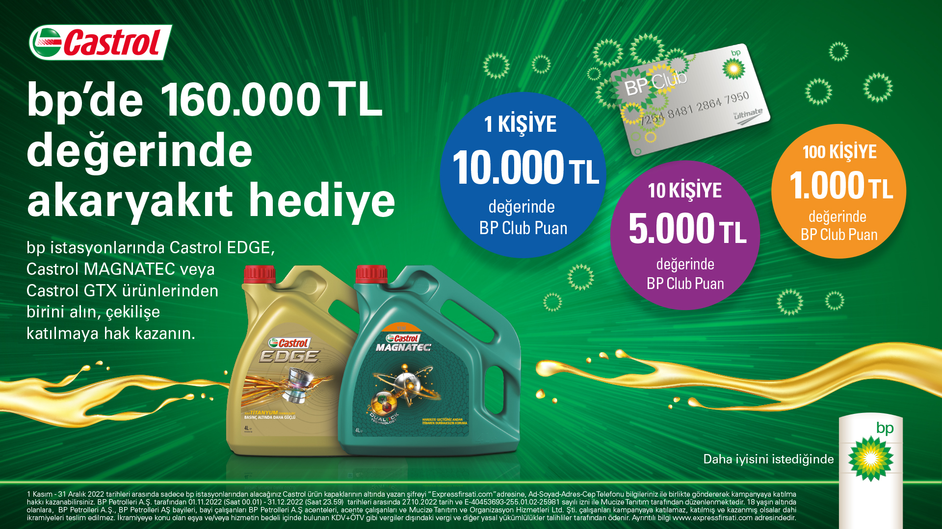 bp ve Castrol’ün birlikte gerçekleştirdiği kampanya ile bp istasyonlarından Castrol EDGE, Castrol MAGNATEC ve Castrol GTX alan 111 kişi toplam 160 bin TL akaryakıt değerinde bp Club Card puanı kazanma şansına sahip olacak.
