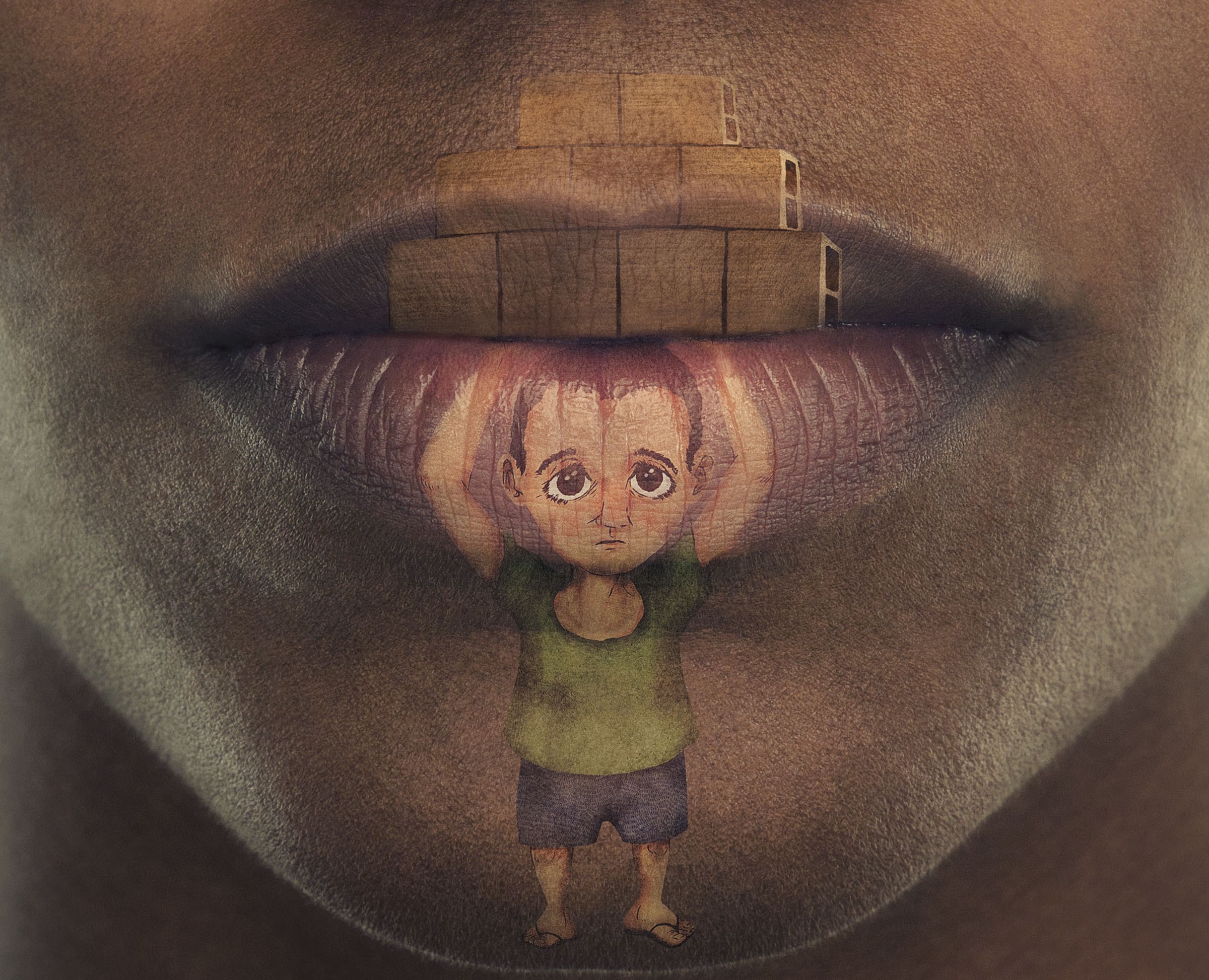 Kampanya afişlerinde başında yük taşıyan çocuk resimleri yetişkin insanların dudaklarına çizilmiş. Ve çocukların başından bu yükü kaldırmak için yetişkinlerin ağzını açması gerekiyor.