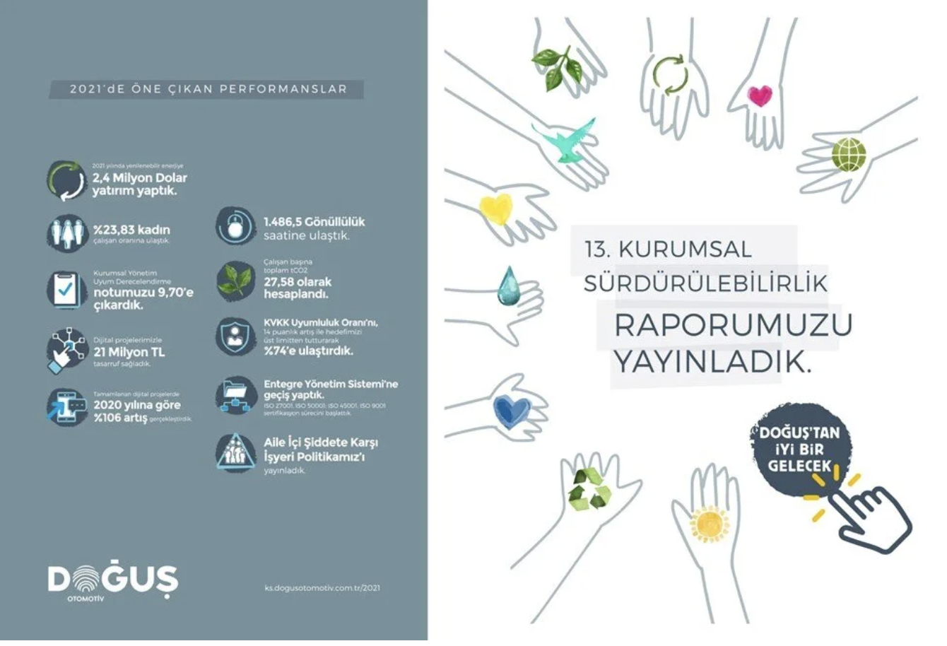 2009 yılından bu yana sürdürülebilirlik performansını paydaşlarına uluslararası standartlarda rapor yayınlayarak ulaştıran Doğuş Otomotiv, bu yıl 13. kez yayınladığı 2021 yılı raporunu entegre rapor olarak yayınladı.
