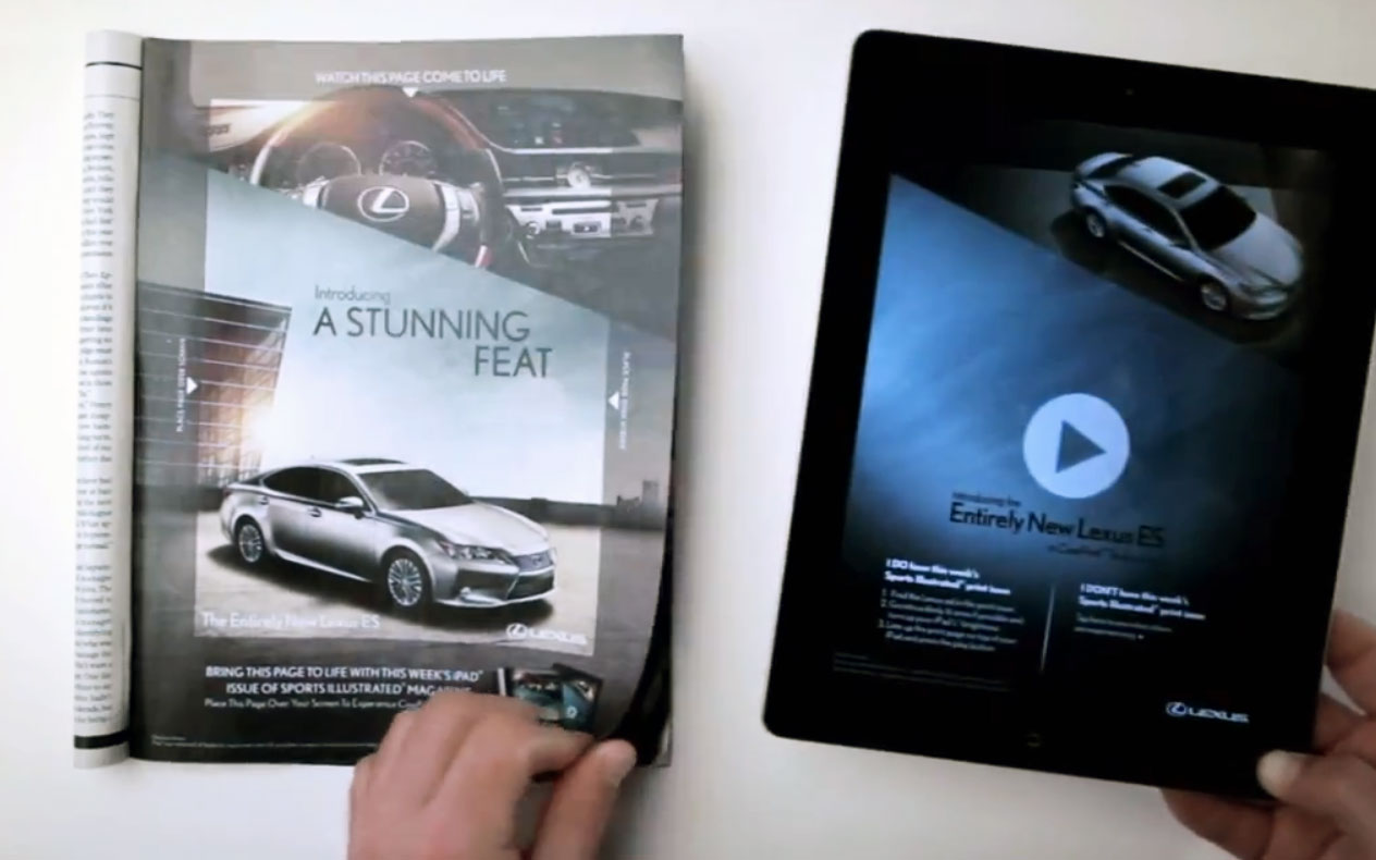 Sports Illustrated Ekim ayında Lexus 2013 ES’in interaktif bir basılı reklamına yer verdi. Lexus 2013 ES bu interaktif baskı reklamı rengini değiştiriyor, ışıklarını açıyor ve müzik çalarken içini gösteriyor.