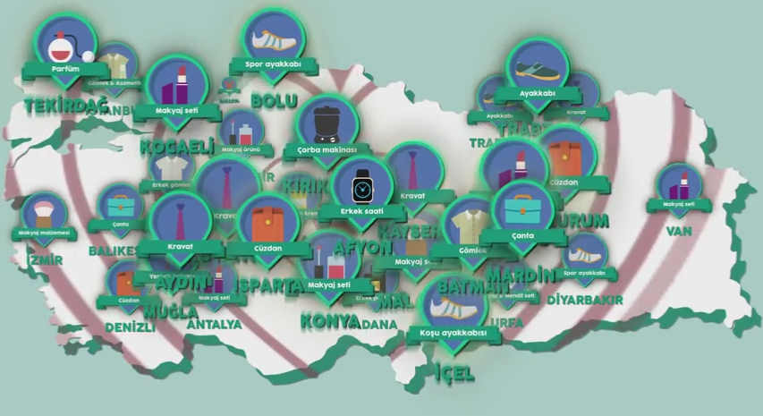 Sevgi Haritası, hangi illerde hangi hediyelerin daha çok tercih edildiğini de ortaya koydu. İllere göre Sevgililer Günü hediye tercihlerinden bazıları ise şöyle; Adana: erkek parfüm, Ankara: cilt bakım kremi, Antalya: makyaj seti, Balıkesir: çanta, Batman: gömlek, Bursa: erkek gömlek, Diyarbakır: spor ayakkabı, Elazığ: makyaj seti, Erzurum: cüzdan, Eskişehir: makyaj ürünü, Gaziantep: klasik gömlek, Hatay: kozmetik, İstanbul: gömlek ve kozmetik, İzmir: makyaj malzemesi, Kahramanmaraş: kazak, Kars: mont, Kocaeli: makyaj seti, Konya: makyaj seti, Malatya: makyaj seti, Mardin: çanta, Rize: kravat, Sakarya: kaşkol, Urfa: kravat-mendil seti, Tekirdağ: parfüm, Trabzon: ayakkabı, Van: makyaj seti.