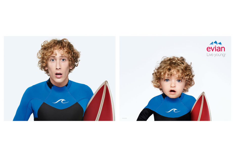 BETC Paris’in yarattığı reklam filminde, sörf yapan genç bir adam sörf tahtasından düşer ve gözlerini bir kumsalda açar. Etrafında ise Evian bebekleri vardır…