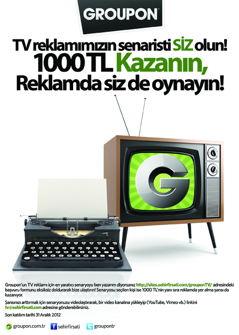 Groupon’un yeni televizyon reklamının senaristi olmak isteyenler, yarışmada şanslarını artırmak için senaryolarını çekip videoyu bir video kanalına (YouTube, Vimeo vb.) yükledikten sonra linkini tv@sehirfirsati.com adresine gönderebilirler. Sonucu 14 Ocak 2013 tarihinde açıklanacak olan yarışmada senaryosu seçilen kişi 1000 TL’nin yanı sıra reklamda yer alma şansı da kazanacak.
