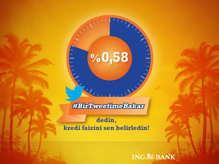 Saat 21.00 kuşağında yayınlanan ING Bank tanıtıcı reklamında “Ne kadar çok tweet o kadar düşük faiz” sloganıyla herkes ihtiyaç kredisi faiz oranının düşmesine katkı sağladı. Saat 23.10 itibarıyla 10 bine yakın tweet gönderimi sonucunda aylık faiz oranının yüzde 0,58’e indiği seyircilerle paylaşıldı.