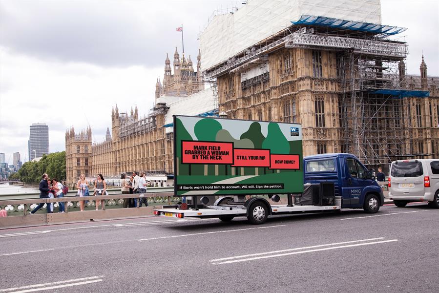 Feminist siyasi parti Kadın Eşitliği Partisi, daha önce kadın bir Greenpeace aktivistine şiddet uygulayan Parlamento Üyesi Mark Field’a karşı bilboard kampanyası başlattı. Kırmızı zemin üzerine yazılan yazıda: “Mark Field bir kadını boğazladı. Hala Parlamento Üyesi. Nasıl olur?” yazıyor.