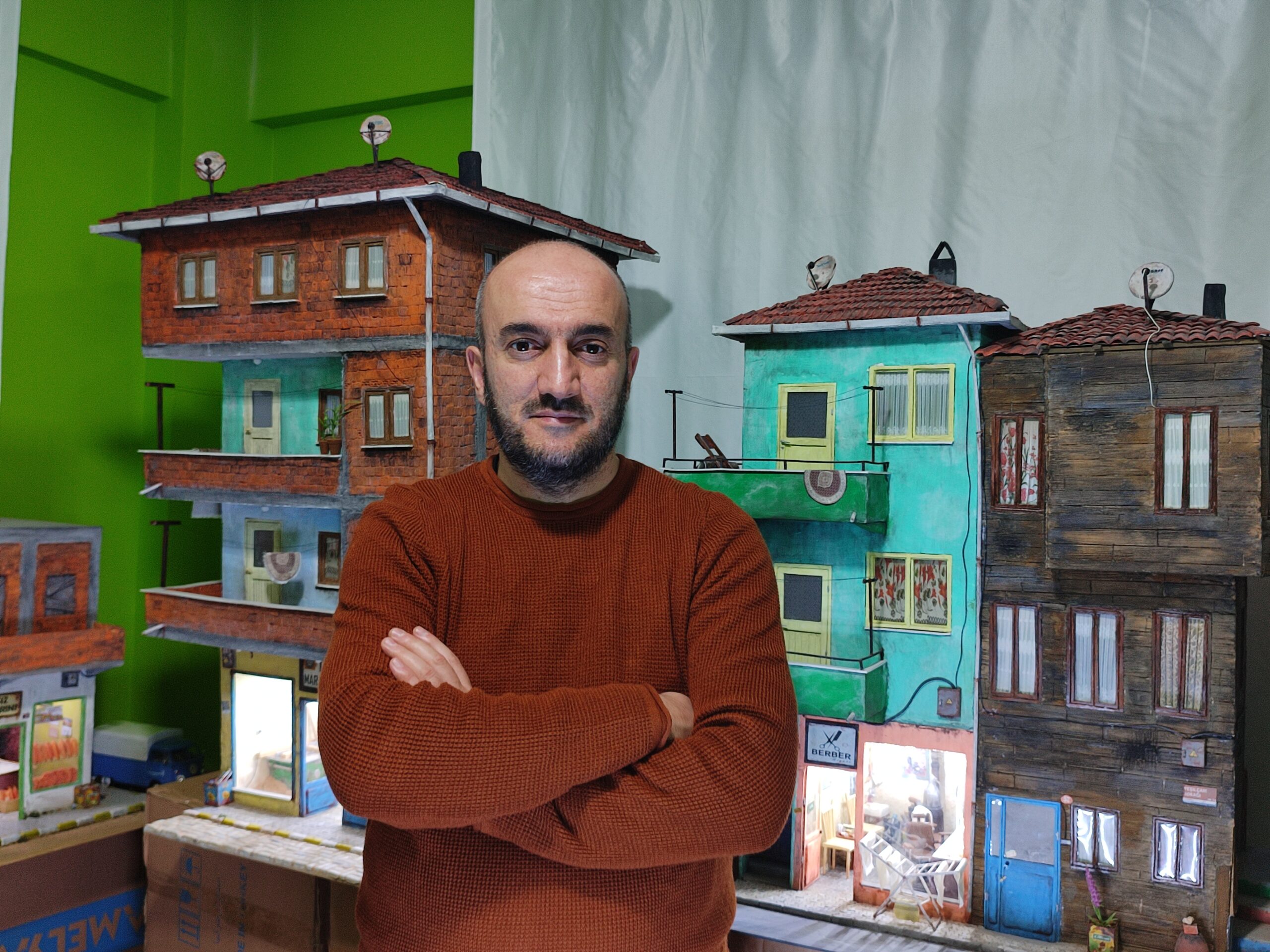 İsmail Kuş: Yaptığım çalışmalarda önce hangi mekanı yapmalıyım diyerek işe başlıyorum. Kararını verdiğim mekanda hangi malzemeler olmalı, hangi aletler kullanılmalı bunun araştırmasını yapıyorum. Hafızamda tasarlıyor, internetten araştırmasını yapıyorum ve bazen benzer mekanlara giderek referans fotoğraflar çekiyorum. Önce mekanın içini yapıyorum sonra dışını yapmaya başlıyorum. Yaptığım çalışmalarda kil, ahşap, plastik parçalar, karton, mukavva, strafor köpük, metal veya çöpe atılan bir elektronik aletin içindeki tüm küçük parçalar dahil her türlü malzemeyi kullanıyorum.