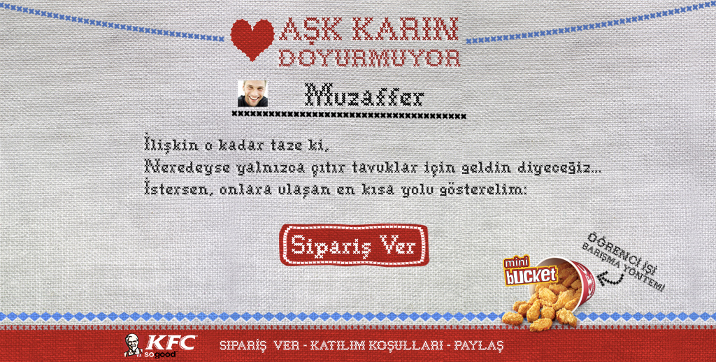 KFC’nin, ‘Aşk karın doyurmuyor’ adlı Facebook uygulamasına girenler için görev pek de kolay değil. “KFC mi yoksa sevgilin mi” sorusuyla karşılaşan kullanıcıların, açlığına yenik düşüp KFC’yi seçtiği takdirde, ilişki durumunu kaldırması ve Sevgililer Günü bitimine kadar ‘İlişkim yok’ konumunda tutması gerekiyor. Bu şekilde KFC’ye olan aşkını ispat edenler Mini Bucket kazanıyor.