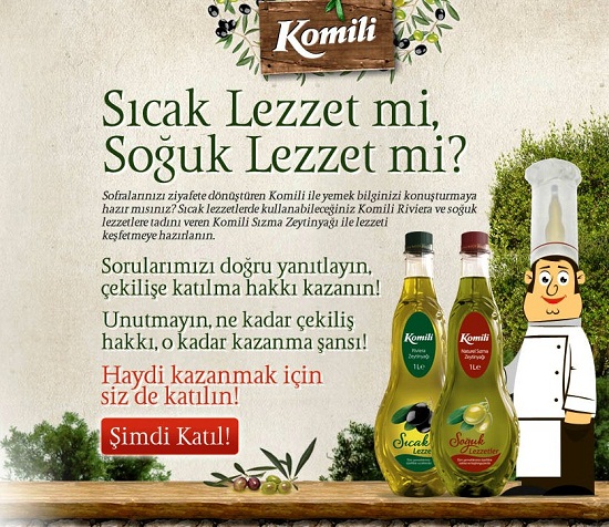 Online bilgi yarışmasında zeytinyağı mucizesinin sıcak ve soğuk lezzetlerden hangisi ile daha iyi gideceği soruluyor ve soruları en kısa zamanda doğru yanıtlayanlar Komili’nin yeni sıcak ve soğuk ürünlerinden kazanıyor.