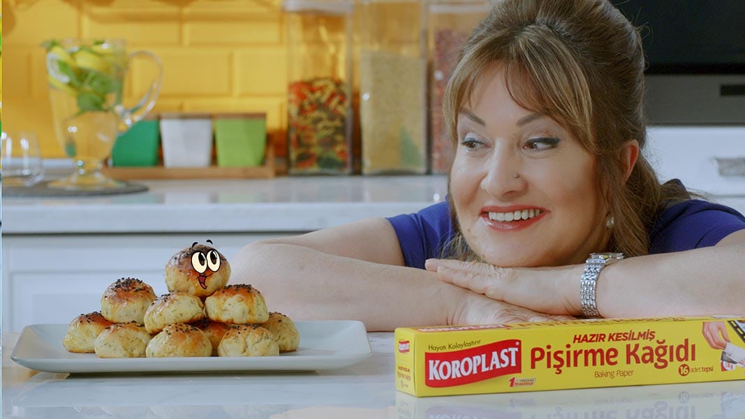 Koroplast’ın iç yüzeyi pişirme kağıdı, dışı ise alüminyum folyo olan yeni ürünü Koroplast Sar Pişir’in reklam filminde ise Sahrap Soysal’ın Sar Pişir’le yaptığı yemek gösteriliyor.