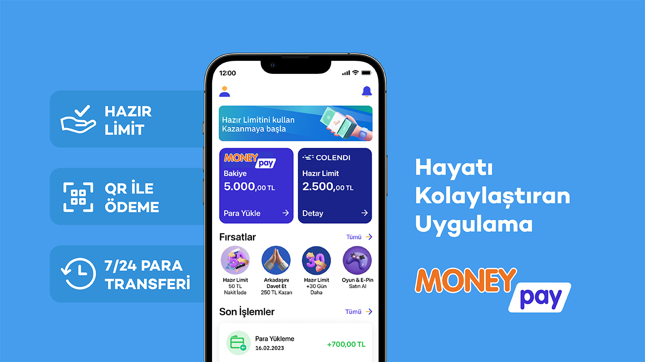 MoneyPay, hazır limit ile kullanıcılara tanımlanan 30 gün sonra masrafsız geri ödeme imkânı, 7/24 para transferi, QR ile hızlı ve kolay ödeme yöntemi gibi fonksiyonlarıyla tamamen ‘hayatı kolaylaştırmaya’ odaklı bir uygulama.