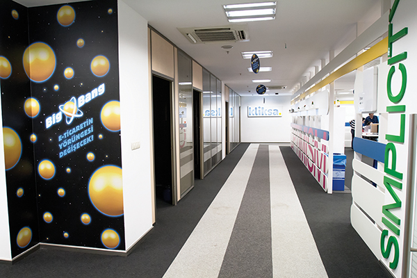 İç tasarımdaki renklerde de markanın avantajlı olduğunu söyleyen Safkan, özellikle “sarı nokta”nın kendilerine esneklik sağladığını ve çok rahatlıkla kullanılabildiğini söylüyor. Ofiste sarı nokta haricinde marka sloganları “Varsa yoksa Kliksa”, lansmanda yer alan reklam yüzü ve şirketin yeni projesi Big Bang de yer alıyor.