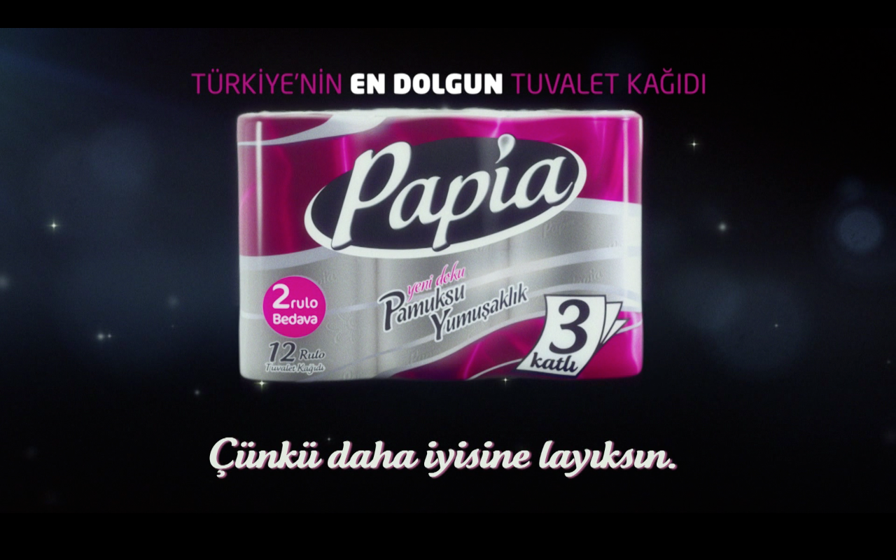 Papia’nın “Kalite yarım yaşanır mı?” reklam filmi, tiyatro oyuncusu Gülen Karaman ile oyuncu Hazım Körmükçü’nün seslendirmesiyle yayınlanıyor. “B-side teknolojisi” ile “en dolgun” yaprak özelliğine sahip Papia, önü ve arkası aynı olan tuvalet kağıdı olma özelliğiyle lüks tercihler olarak bilinen objelerden tek taş yüzük, antika bir vazo ve şık bir çantanın yarım haliyle reklamda anlatılıyor. Yönetmenliğini Hüseyin Bilir‘in yaptığı reklam filmi Finlandiya‘da hazırlandı.