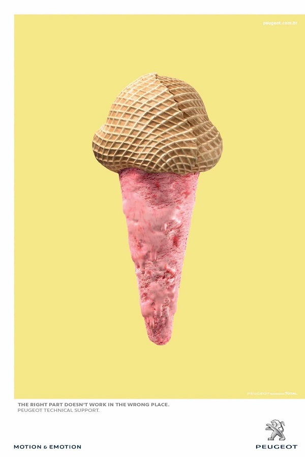 Y&R Brezilya’nın Peugeot’nun teknik destek servisi için yaptığı reklamda sapıyla fırçası yer değiştirmiş bir boya fırçası, külahıyla dondurma kısmı yer değiştirmiş bir dondurma ve yine sapının yer değiştirildiği bir mutfak bıçağı görüyoruz.