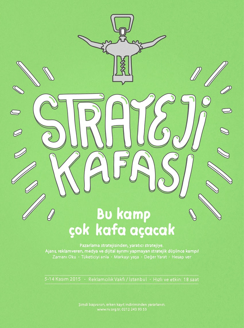 Reklamcılık Vakfı‘nın 05 – 15 Kasım 2015 tarihleri arasında gerçekleştireceği “Strateji Kafası” kampı yaratıcı stratejiye ajans, reklamveren, medya ya da dijital ayrımı yapmadan yaklaşmayı amaçlıyor. Erol Batislam, Toygun Yılmazer ve Nüzhet Algüneş liderliğinde gerçekleştirilecek ve toplamda 18 saat sürecek eğitimlerde “Kafa Açıcılar”ın yanısıra her modülde 3 konuşmacı yer alacak ve konuşmacılar teyit edilecek.