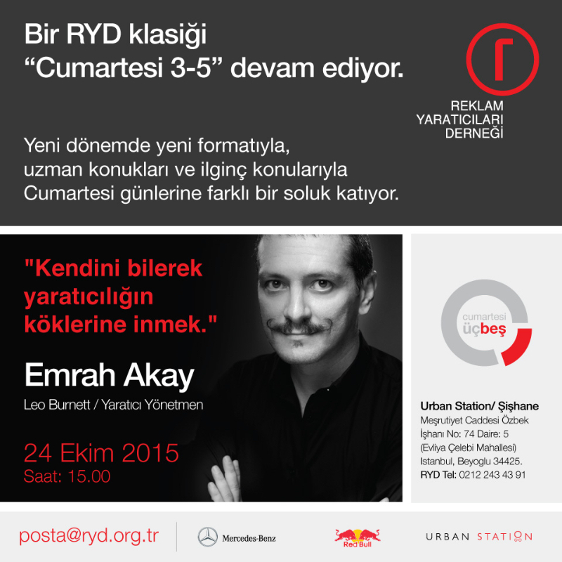 Bu haftanın konusu Leo Burnett Yaratıcı Yönetmeni Emrah Akay‘la; “Kendini bilerek yaratıcılığın köklerine inmek.” Etkinlik 24 Ekim Cumartesi günü saat 15:00’te Urban Station, Şişhane’de gerçekleşitirilecek.