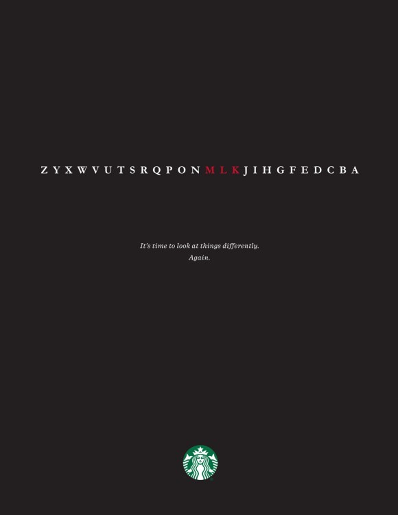 Starbucks, Martin Luther King Jr. gününü etkili bir basın ilanıyla andı. New York Times gazetesinin pazartesi günkü sayısında çıkan ilanda siyah fontlu alfabeyi tersten görüyor okuyucu ve kırmızı fontla K, L ve M harfleri dikkat çekiyor. Bu dizimin altında, “Farklı bakmanın zamanı geldi, tekrar” ifadesi yer alıyor.