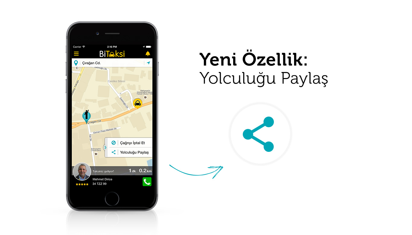 Taksi ile çocuğunuzu bir yere gönderdiniz ama aklınız devamlı onda… Başına bir şey gelir mi? Güvenli bir şekilde yolculuk ediyor mu? Acaba ulaştı mı? Ya da geç saatte bir yere gideceksiniz. İlk yaptığınız iş, bindiğiniz taksinin plakasını bir yakınınıza mesaj atmaksa BiTaksi uygulamasının size bir haberi var. Akıllı telefondan taksi çağırma uygulaması BiTaksi yolculuğu yakınlarınızla paylaşmanızı sağlayan geliştirmesini duyurdu. Yeni özellik sayesinde bindiğiniz taksinin sürücü ve plaka bilgilerini, sürücü puanını, aracın haritada nerde bulunduğunu, SMS, WhatsApp ya da diğer sosyal ağlar aracılığıyla dilediğiniz biriyle paylaşabilir, onların da yaptığınız yolculuğu gerçek zamanlı olarak takip etmesini sağlayabilirsiniz.