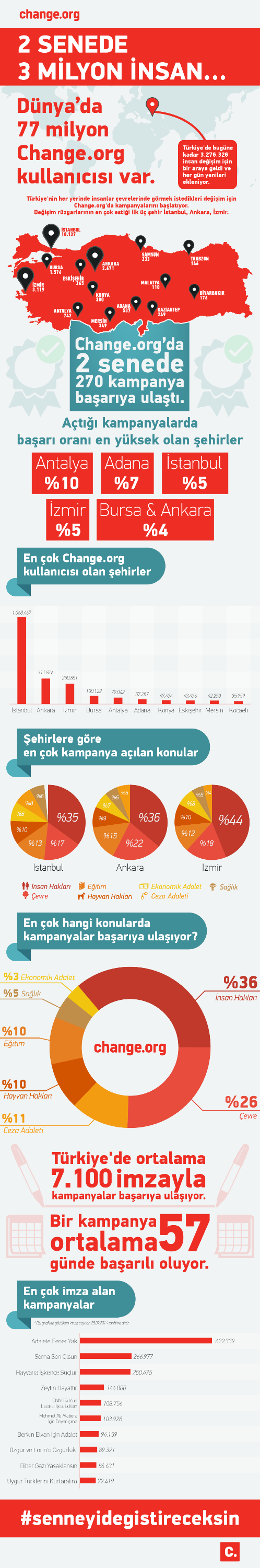 Change.org, bireylere değiştirmek istedikleri şeyler için imkan sağlarken aynı zamanda karar vericilere vatandaşların, tüketicilerin isteklerini dinleme olanağı da yaratıyor. Change.org’da başarının anahtarı ise imza sayısı desteğini artırırken aynı zamanda platformu bir örgütlenme aracı olarak kullanmakta. Aşağıdaki infografikle, 2 senedir Türkiye’nin değişim taleplerinin fotoğrafını çeken site bu başarıyı tatmak için size de soruyorlar; #senneyidegistireceksin.