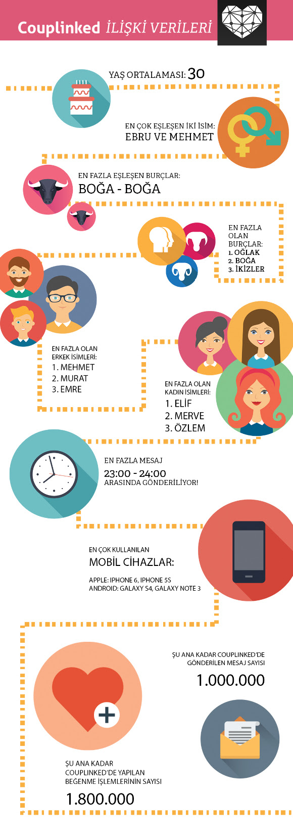 Sanal ortamda ilişki bulmaya yarayan mobil uygulama Couplinked, ilişki istatistiklerini açıkladı. En çok eşleşen isimlerden, burçlara ve eşleşme saatlerine kadar ilginç verileri kapsayan infografiği aşağıda bulabilirsiniz.