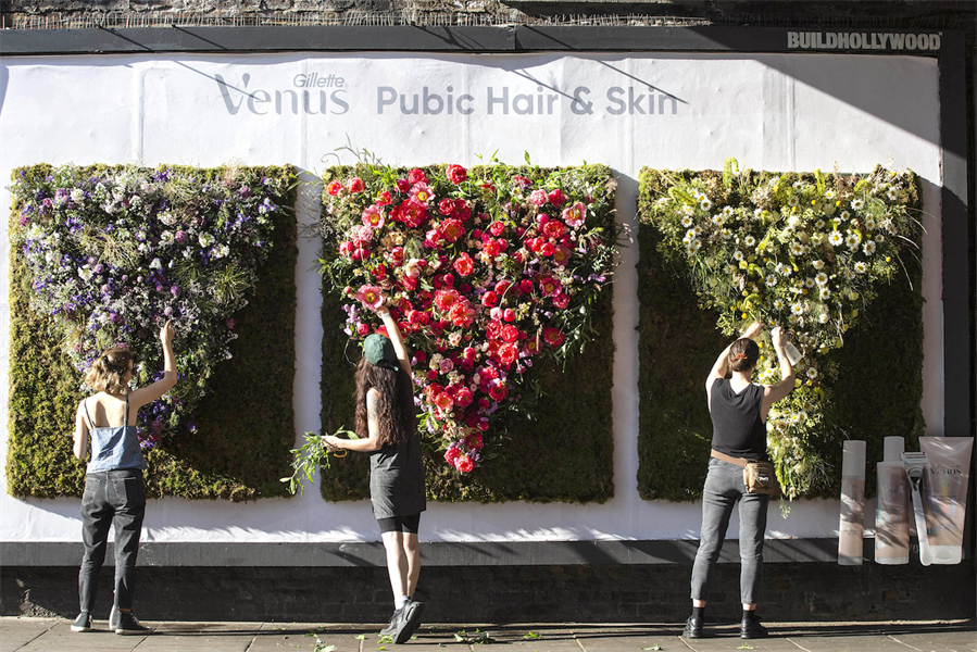 Güzellik markası Venus, Londra’da kadınların cinsel organ çevresindeki tüyleri andıran çiçekli vitrinlerin yer aldığı iki reklam panosu yerleştirdi.
