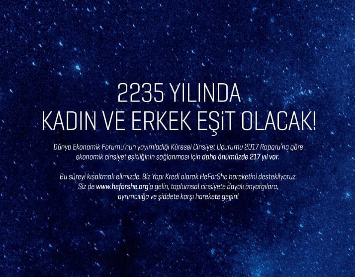 Yapı Kredi’nin 8 Mart Dünya Kadınlar Günü ilanında Dünya Ekonomik Forumu Küresel Cinsiyet Uçurumu Raporu’nda ekonomik cinsiyet eşitliğinin sağlanması için dünyanın 217 yıla daha ihtiyacı olduğu vurgulandı. Çok uzak bir gelecekten bahsedilmesine atıfta bulunan uzay ortamının kullanıldığı tasarımda “2235 Yılında Kadın ve Erkek Eşit Olacak” başlığı kullanıldı. Yapı Kredi 8 Mart dolayısıyla herkesi heforshe.org web sitesini ziyaret ederek toplumsal cinsiyete dayalı önyargılara, ayrımcılığa ve şiddete karşı harekete geçmeye davet etti.